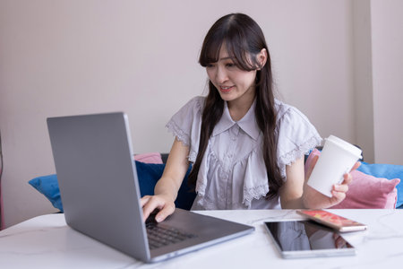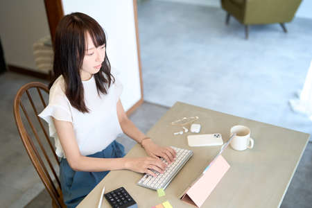 A Japanese woman working by laptop in the living room