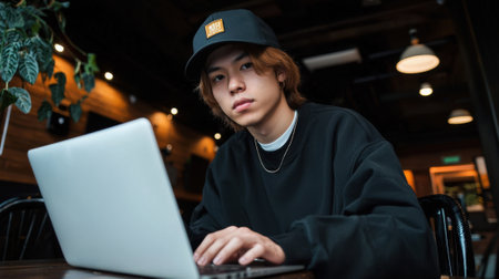 A young man wearing a black hat and a black shirt is sitting at a table with a laptop