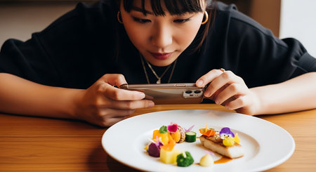 A woman in a black shirt photographs a plate of colorful food art with her smartphone. The dish includes vegetables and edible flowers on a white plate, set on a wooden table.