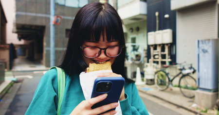 Browsing, smile and woman with smartphone, snack and reading of timetable for exam, eating and campus. Outdoor, education and Asian person with food, scroll and check of schedule, mobile and Japan
