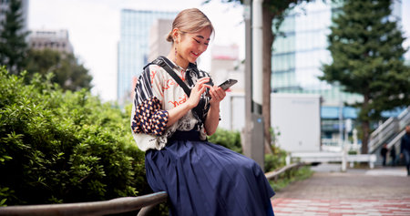 Japanese, woman and smartphone in park, travel and communication with social media and adventure. Texting, email and online chat with connectivity, mobile app and outdoor for fresh air in Tokyo