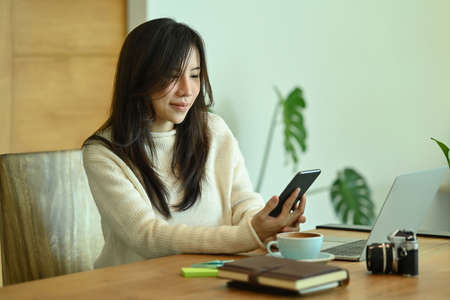 Young woman sitting in front of laptop computer and checking social media on her smart phone.