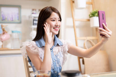 shoulder shot with closeup view happy asian woman smiling for being praised about her cooking while having lunch at home