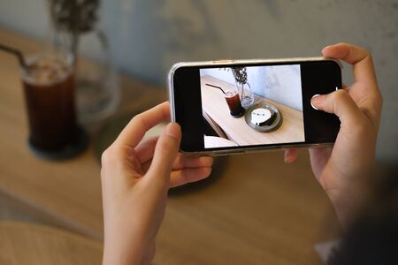 A girl take a picture by smartphone camera in coffee cafe