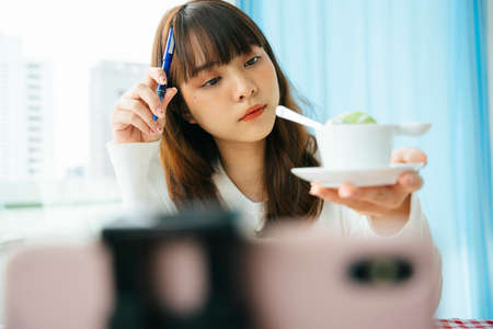 Young asian dark hair woman food reviewer examine thai dessert before writing a review.