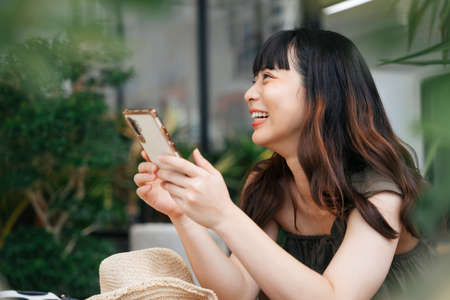 Side view - Young asian woman holding smartphone order food in cafe outdoors.