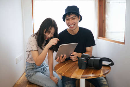 Photographer and model look at the photo in tablet and laugh together.