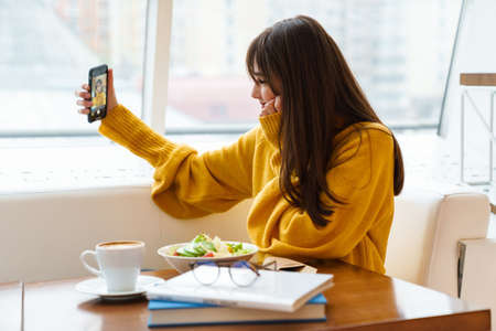 Charming happy girl taking selfie on mobile phone and having lunch in cafe indoors