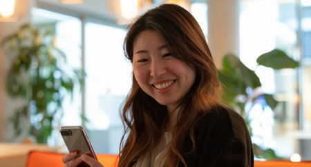 A smiling Japanese female professional utilizing her smartphone in a creative, contemporary office setting.