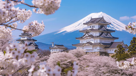 Traditional Japanese castle with blooming cherry blossom trees in the foreground, under a bright blue sky.