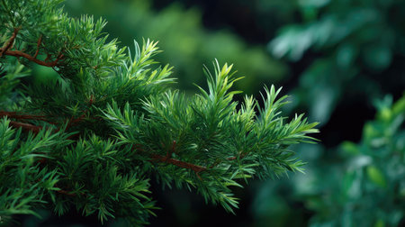 This close-up image captures the vibrant green pine needles on branches, set against a softly blurred background, evoking a serene and tranquil forest atmosphere.