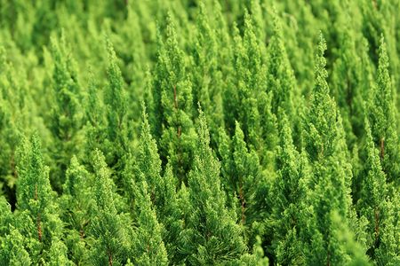 Close look at the green coniferous bush. Side view