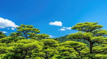 A scenic view of pine trees in Japan with their lush green needles swaying under a clear blue sky, perfect for capturing the essence of nature.