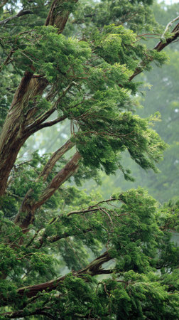 Eastern red cedar in a storm, heavy rain pouring down, strong winds twisting their leaves, natural.