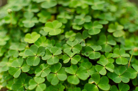 Green shamrock natural background. Selective focus on a central leaves.