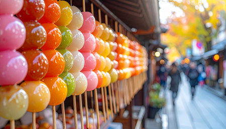 Brightly colored candied fruits on skewers arranged in rows at a Japanese street food market