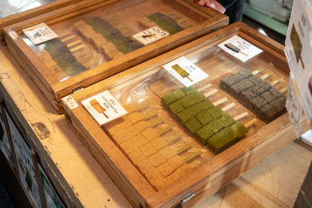 TOKYO, JAPAN - NOVEMBER 06, 2019: Japanese traditional dessert, Mochi sell in Tsukiji outer market in Tokyo, Japan.