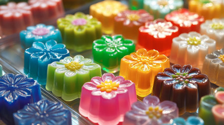 A vibrant display of flower-shaped jelly treats in various colors. Perfect for celebrations, parties, or artistic dessert presentations.