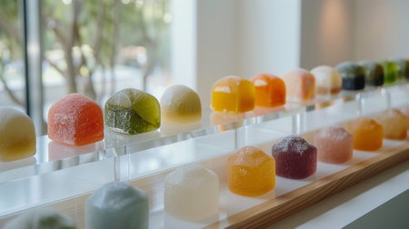 mochi desserts in different colors, shapes, and flavors showcased at a sleek dessert bar, presenting a unique mochi tasting experience