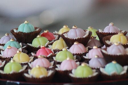 Assortment of chocolate colorful candies desserts on cafe showcase. Variety of sweets with different flavours nuts spices in store. Confectionery
