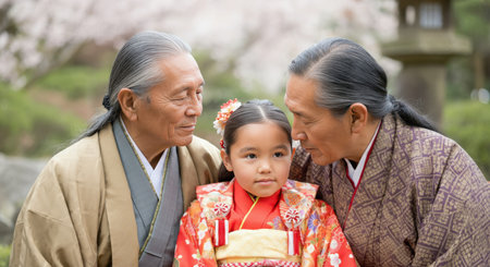 Generations united in tradition: elderly and young family in japanese garden with cherry blossoms