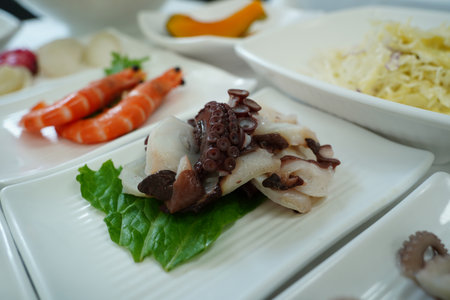 Close-up of Freshly Sliced Raw Squid Served as Side Dish in Korean Seafood Restaurant