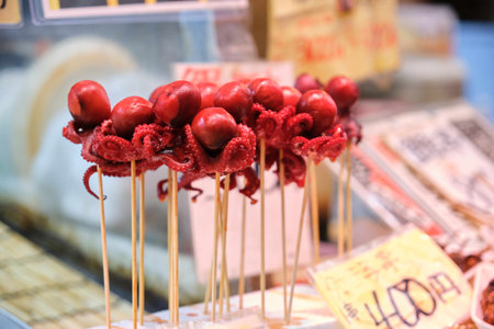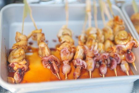 Japanese BBQ Grill octopus skewer is popular in street food at fresh market in Japan