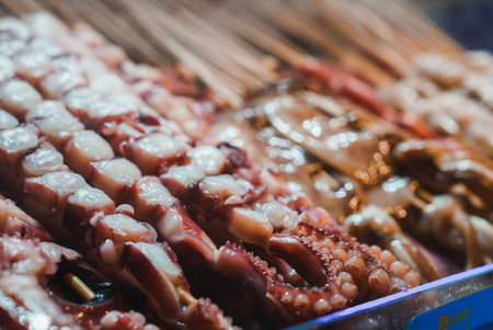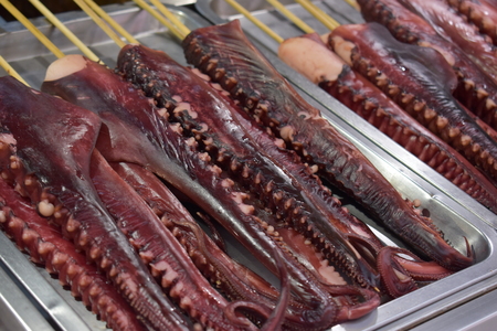 Grilled octopus on skewers in the market. Close up