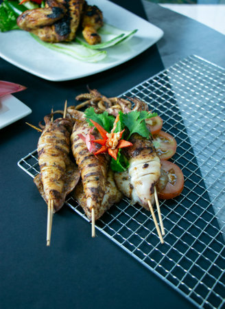 Squid grilled by charcoal fire placed on a wood plate. Delicious famous Thai seafood.