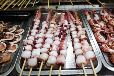 Octopus on wooden sticks for grilling. A dish of Chinese cuisine.