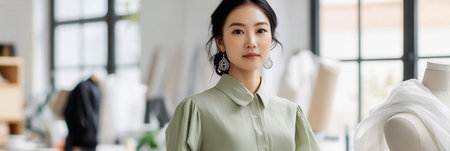 An elegant young Asian woman stands confidently in her spacious workshop, holding a mannequin draped in light, multi layered fabric.