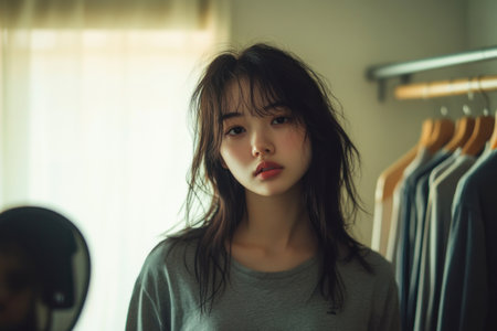 beautiful Asian lady getting ready to go out in front of the mirror
