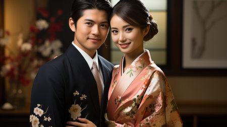 Portrait of a young asian couple wearing traditional japanese kimono