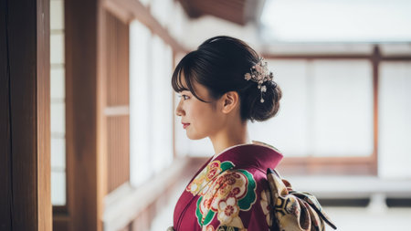 Young Japanese woman in kimono, formal updo, looking outside traditional house