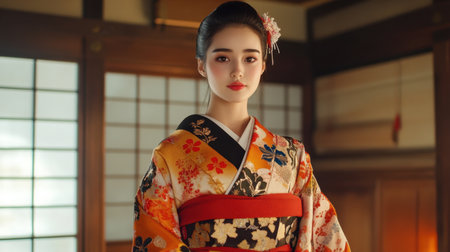 Young woman in kimono, indoors, elegant pose, traditional attire