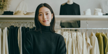 A woman is smiling while standing in a clothing store. She wears a dark sweater and has sleek hair. Racks of various clothes are arranged behind her in neat order.