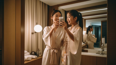 Young Japanese women in kimonos dressing in traditional room.