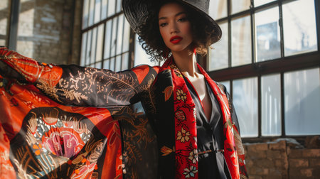 A stylish woman wearing a vibrant kimono and a hat in a modern industrial setting