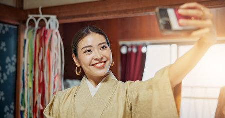 Selfie, smile and woman in kimono, city and fashion designer with traditional clothes and photography. Outdoor, face and picture of Asian person, creative and outfit for culture, tailor and Japan