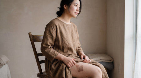 Woman sitting by window in natural light, wearing simple linen dress and revealing birthmark on thigh in calm minimalist interior.