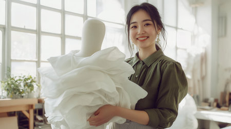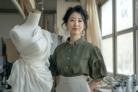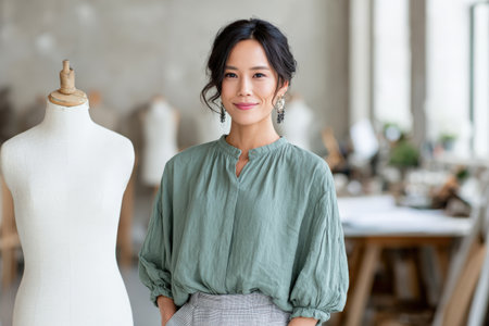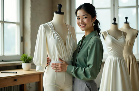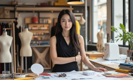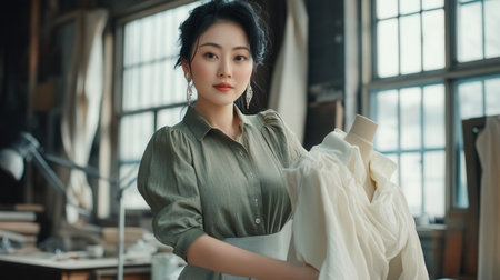 portrait asian female clothing designer standing in her modern studio,concept of business,industry,clothing design,sewing,tailoring,dressmaking