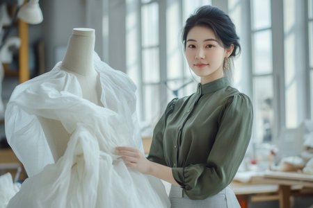 Beautiful young Asian female fashion designer checking her new collection, working in her studio.