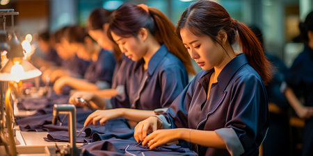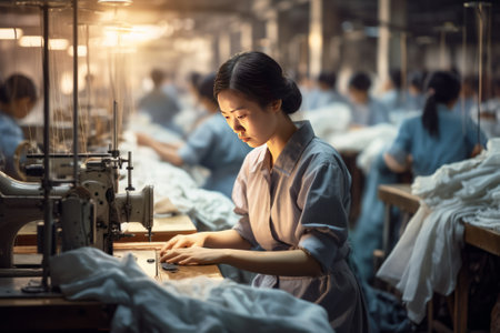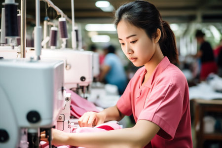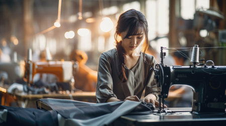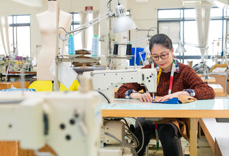 beautiful sweet clothing factory sewing woman using tailor machine making new season product in fashion studio with selective focus photo.