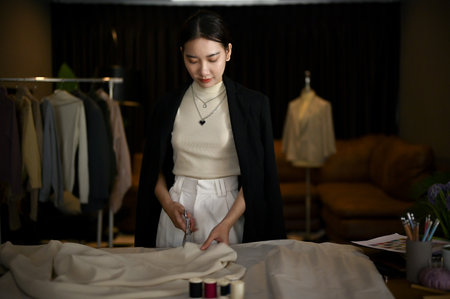 A professional Asian female dressmaker or fashion designer using scissors to cut the fabric, making fabric pattern, working in her studio.