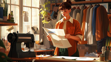 female fashion designer in her workshop studio, fashion designer working with fabric cutouts, beautiful fashion designer is making clothes with high quality fabric, dressmaker, material, clothing