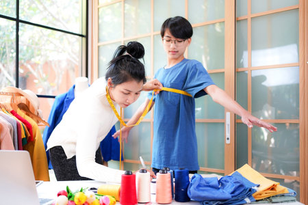 Asian women fashion designer working and measure the customer in the showroom, Lifestyle Stylish tailor clothing design and cutting cloths in studio. Business small Concept