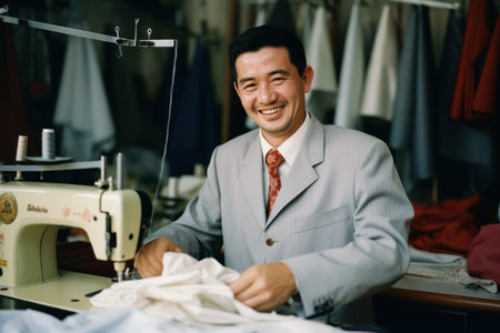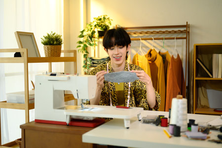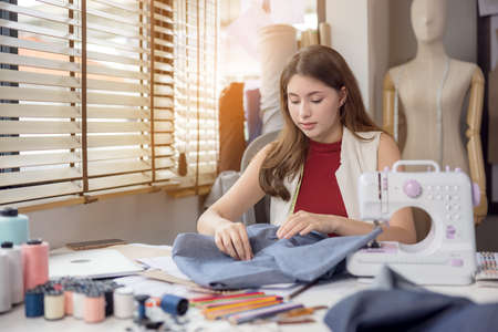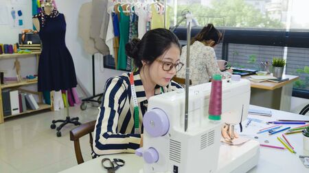 Beautiful asian woman fashion designer tailor fabric working and sewing, creative design in studio tailor shop, occupation owner small business concept
