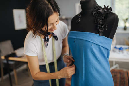 Close up of unrecognizable female tailor fitting designer clothes on mannequin in atelier workshop copy space