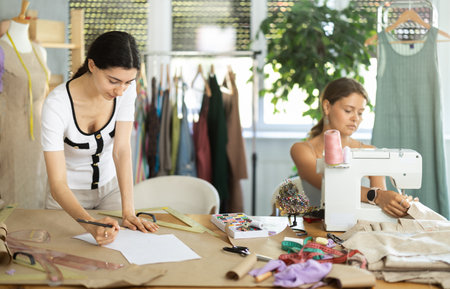 Female designer working with measure tape and sketches. Fashion tailor or sewer in a workshop designing new clothes collection. Woman marking fabric in dressmaking salon.