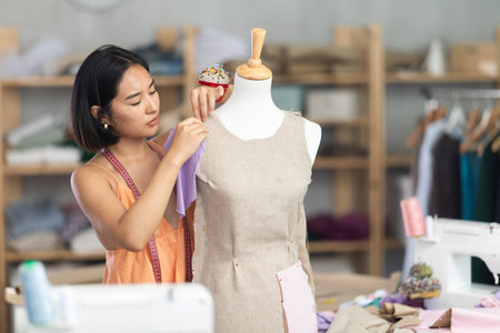 Asian beautiful tailor woman working on clothes in tailoring atelier. Attractive young girl fashion designer use tape measure new handmade suit on mannequin in workshop room. Fashion business concept.